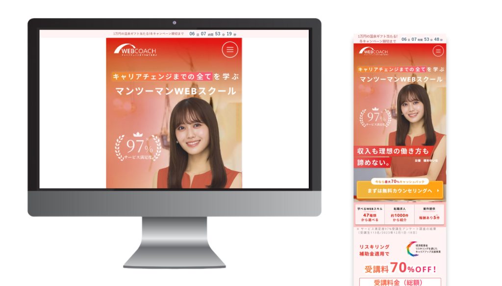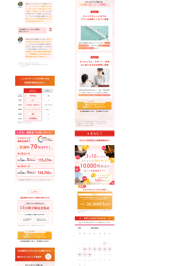 ランディングページ制作 2026年3月4日 最終更新日時 : 2026年3月4日 Nozomi 【製作時間】20時間【使用ソフト】Photoshop・illustrator・Figma・HTML・CSS・jquery【担当業務】デザイン・実装【意識した亊】スクロール離脱を防ぐためjqueryで動きをつけたLPを作成しました。